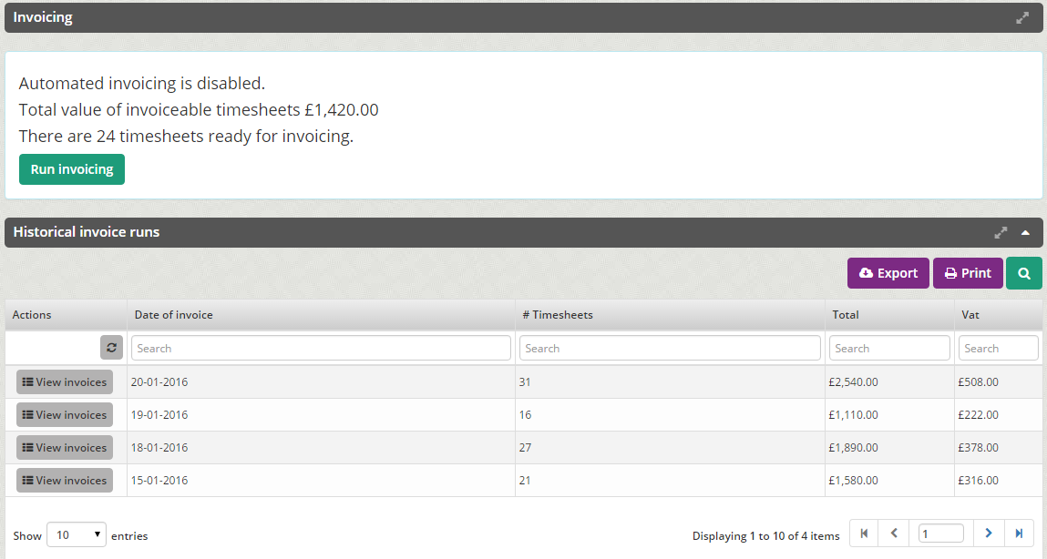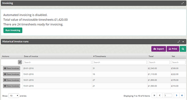 Invoicing can be programmed so it is automated or generated by an officer. CUDOS can confirm the monetary values of the invoices and also state how many invoices are ready to be despatched at any given time. The system states how many timesheets are included per invoice run, as well as the total amounts invoiced, total VAT, and the charge rates, pay rates, gross and net figures.