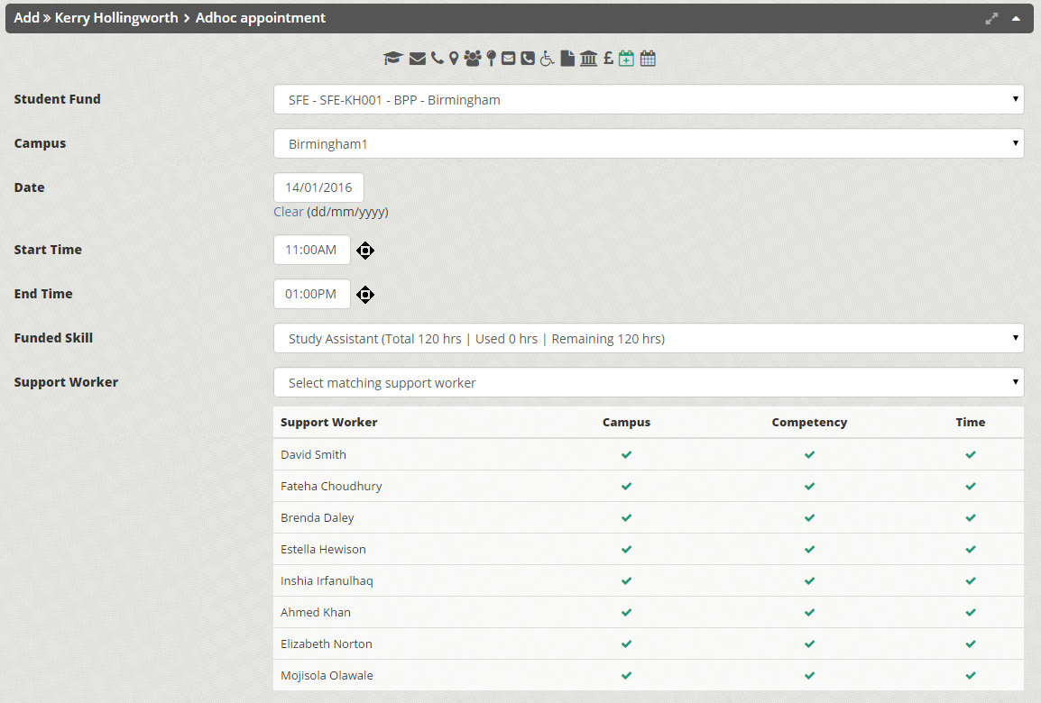 CUDOS matches students with Support Workers based on support type, location and timetable. CUDOS stores the information electronically and contains built in features which allow officers to quickly search for previous matches. This not only creates a huge time saving but also helps contributes to paper free offices.