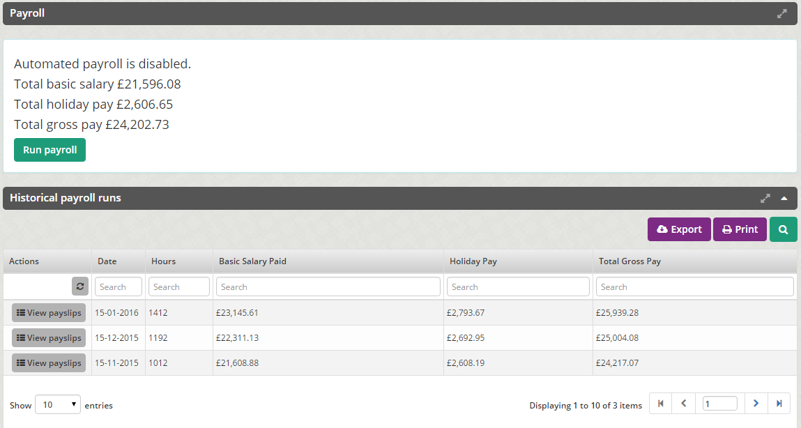 Monetary values such as hourly pay, holiday accrual and total monthly pay are held on the system ready to import to payroll each month.